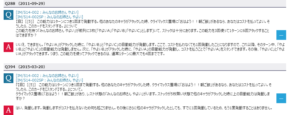 【自】[(5)] この能力は1ターンにつき1回まで発動する。他のあなたのキャラがアタックした時、クライマックス置場に「おはよう!!朝ご飯」があるなら、あなたはコストを払ってよい。そうしたら、このカードを【スタンド】する。