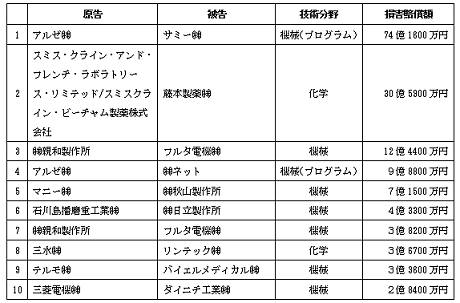 2015年時点での日本の特許侵害訴訟に関わる損害賠償金額トップ10はこれな
