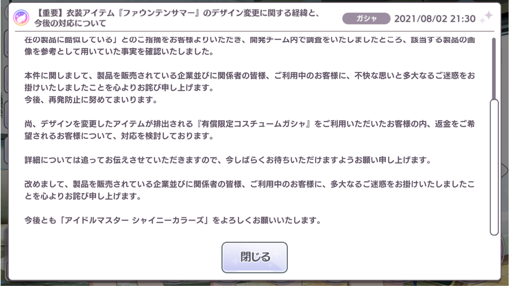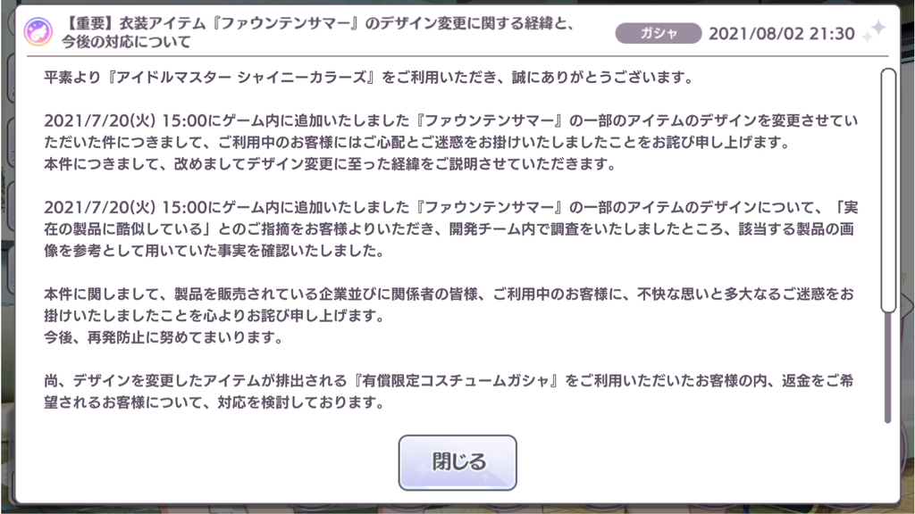 返金したらどうなる?コスチュームガチャ8月31日までだし夏葉と千雪を追っかけようと思ってるんだけど後日変わったアイドルぶん金返してくれるんなら引くが