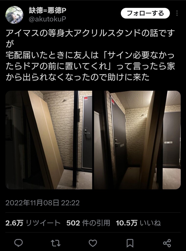等身大アクスタは置き配すると物理的に家から出れなくなるから気をつけてね