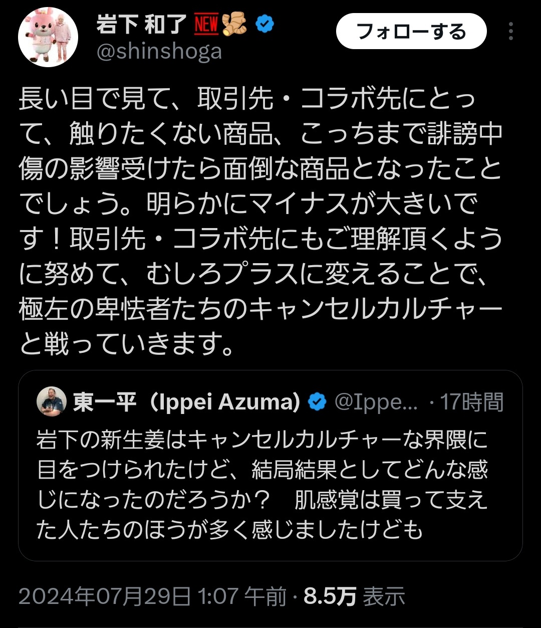 引用元:【悲報】岩下の新生姜社長「(暇空茜支持を表明して)明らかにマイナスが多い」