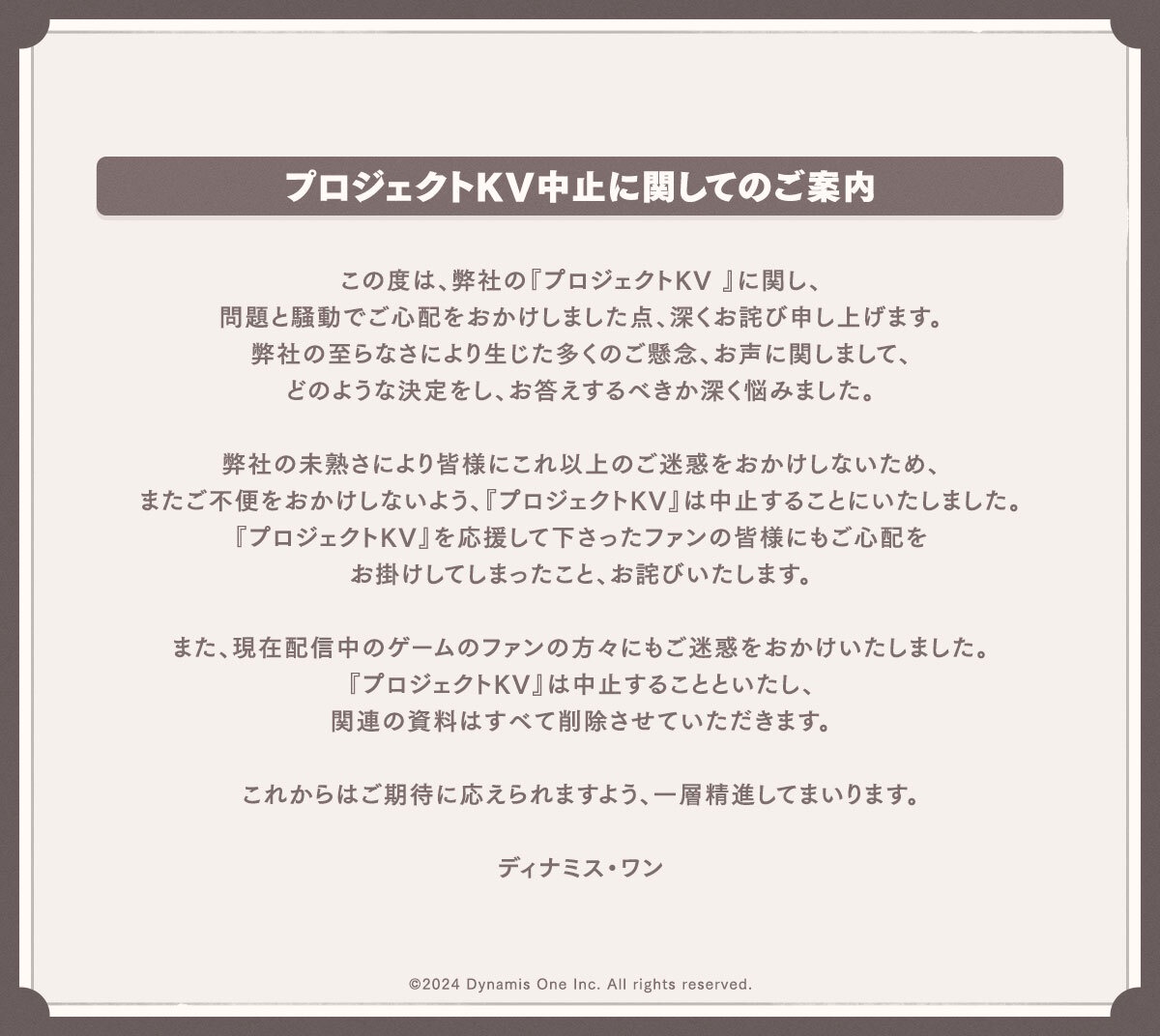 「プロジェクトKV」制作中止が発表。関連資料はすべて削除へ