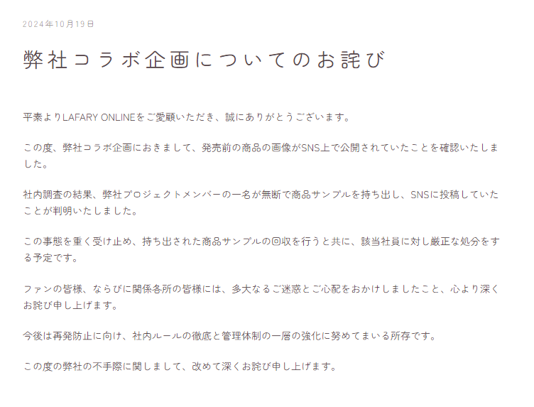 弊社コラボ企画についてのお詫びhttps://t.co/kLRcHxhQJ0