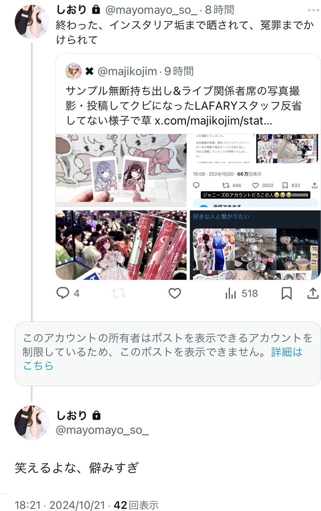 サンプル無断持ち出し&ライブ関係者席の写真撮影・投稿してクビになったLAFARYスタッフ反省してない様子で草 https://t.co/WgQDnNGcFx pic.twitter.com/pQQcu6XuyC