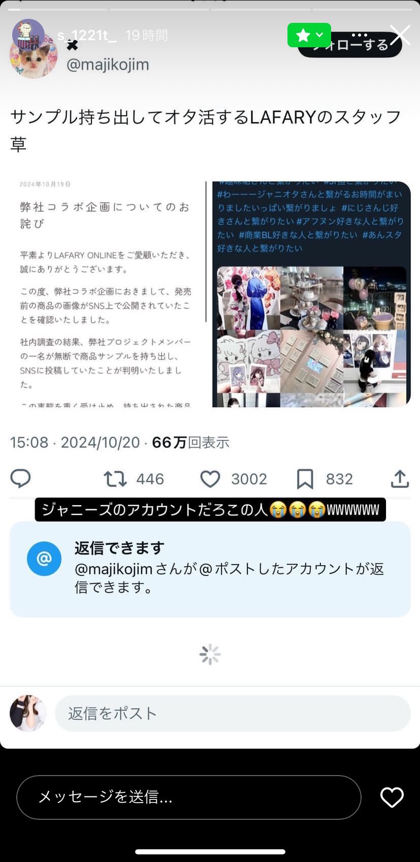 https://x.com/majikojim/status/1848737881852154098?s=46同罪のくせに被害者ヅラするLAFARYスタッフの友達 pic.twitter.com/ayb8TRJD7d