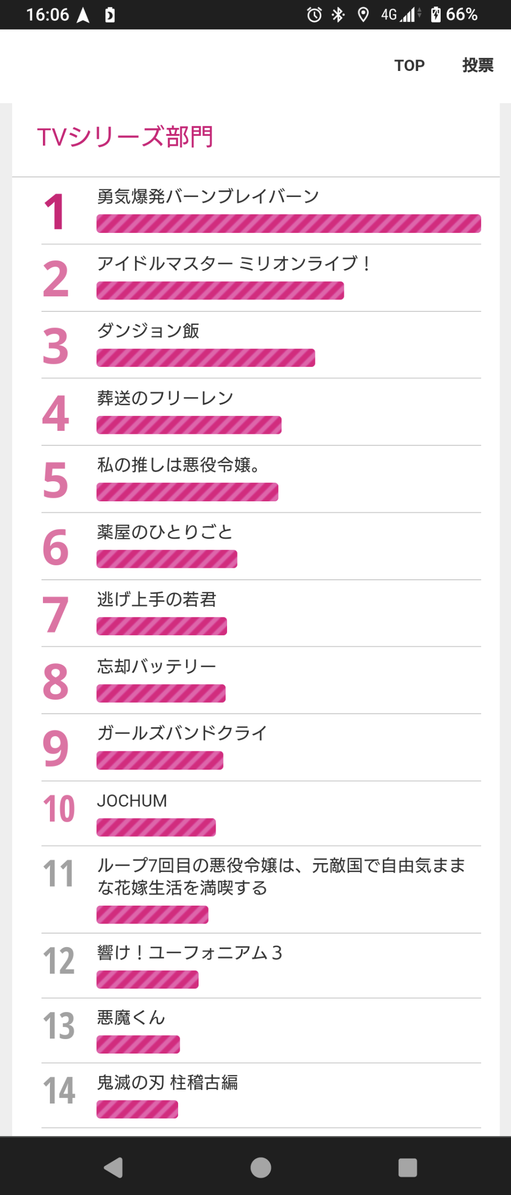 なんでこの作品?って言ってる人多いけどそりゃこの投票してることすら知らない人が多いのと ブレイバーン、ゲ謎、キンドラを投票してるオタクはみんな毎日お祭りの様に仲間を呼び集めて盛り上げてたからな フォローユーザーTLの違いだよな https://t.co/Fdg0nW6EBG
