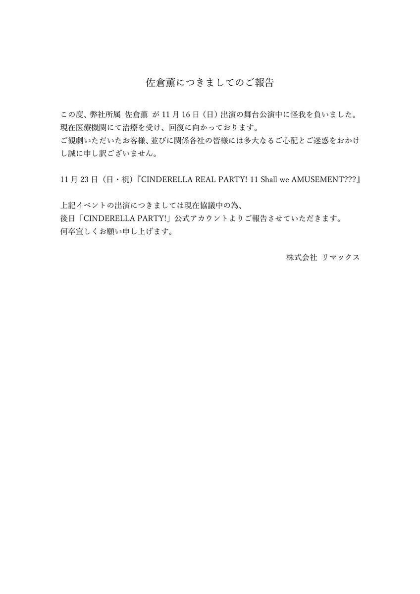 この度、弊社所属 佐倉薫が11月16日(日) 出演の舞台公演中に怪我を負いました。