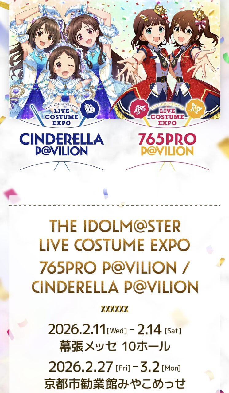 【デレミリ衣装展】「THE IDOLM@STER LIVE COSTUME EXPO 765PRO P@VILION /CINDERELLA P@VILION」が幕張メッセ10ホールと京都市勧業館みやこめっせで開催決定!! #デレミリ衣装展 #idolmaster https://t.co/RVojDIAlDi