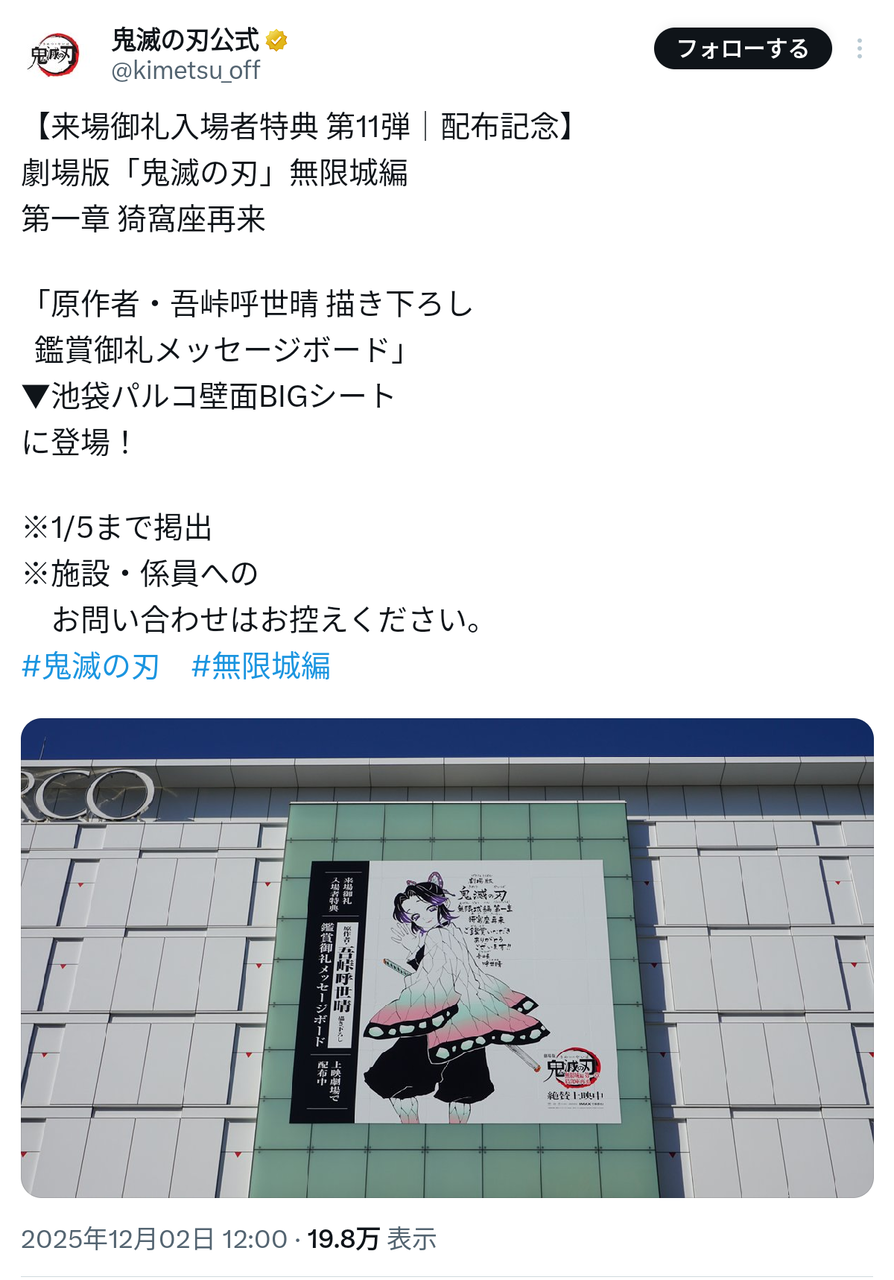 55億2,000万円 劇場版鬼滅の刃無限城編第一章猗窩座再来